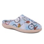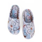Γαλάζιες γυναικείες παντόφλες σπιτιού με σχέδιο ποδήλατο. Το πάνω μέρος της είναι κατασκευασμένο από βελούδινα υλικά για να σας κρατάει ζεστές όλη την διάρκεια της ημέρας στο σπίτι. Η φόρμα τους είναι κανονική, οπότε επιλέγουμε κανονικά το νούμερό μας.