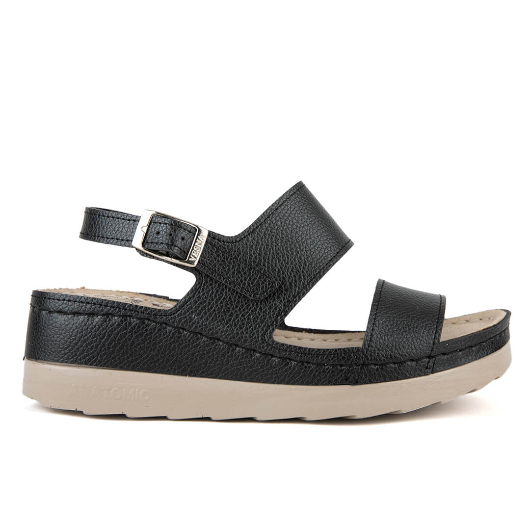Ανατομικά πέδιλα σε μαύρο χρώμα. Το πατάκι είναι μαλακό, ανατομικό και αποτελείται από φυσικό δέρμα περιέχοντας massage gel και αφρώδη υλικά που καθιστούν το περπάτημά σας άνετο και ξεκούραστο. Παράλληλα, ο πάτος είναι διαμορφωμένος με τέτοιο τρόπο ώστε το πόδι να παίρνει την κατάλληλη κλίση. Η σόλα τους είναι αντιολισθητική προσφέροντας ένα σταθερό κι ασφαλές περπάτημα. Ταυτόχρονα, είναι ραμμένη προσφέροντας στο υπόδημα μεγαλύτερη ανθεκτικότητα απέναντι στο χρόνο. Το ύψος της σόλας είναι 5 εκατοστά. Διαθέτουν ρυθμιζόμενο λουράκι στο πίσω μέρος του ποδιού για να ορίσετε εσείς πόσο σφιχτά τα θέλετε. Η φόρμα τους είναι κανονική.