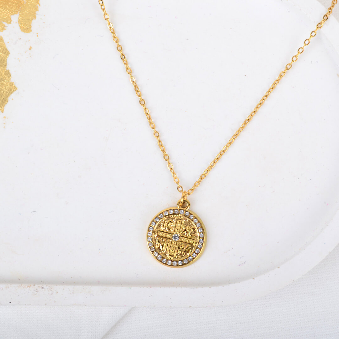 Ατσάλινο κολιέ Ιησούς Χριστός Νικά με λευκά ζιρκόν. Το μήκος του είναι 40cm και διαθέτει αλυσίδα προέκτασης 8cm.