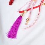 Χειροποίητο κρεμαστό γούρι 2024 φτιαγμένο με ροζ σατέν κορδόνι, μπεζ και κόκκινη σατέν κορδέλα, μωβ φουντίτσα, πέρλες και χρυσό ρόδι.
