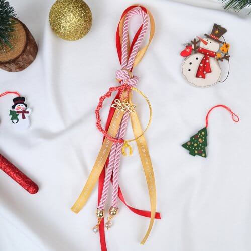 Χειροποίητο κρεμαστό γούρι 2024 φτιαγμένο με ροζ σατέν κορδόνι, κόκκινη και μπεζ σατέν κορδέλα και πέταλο.