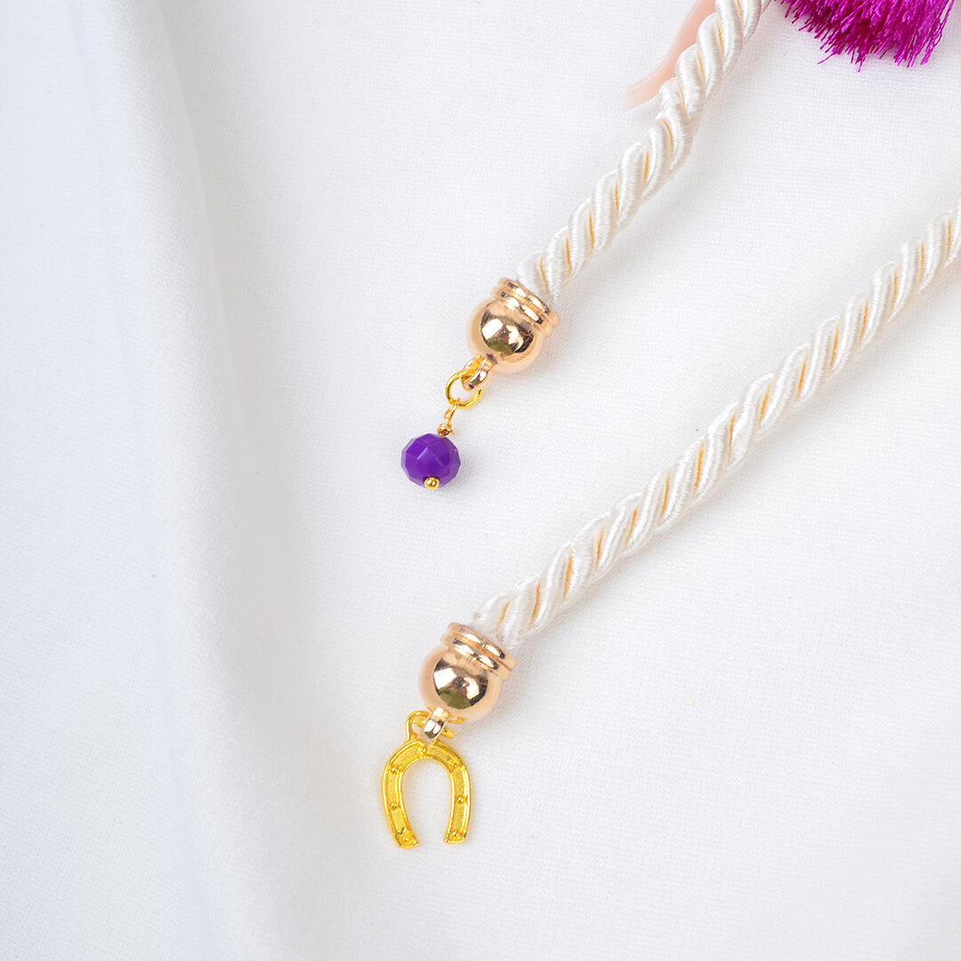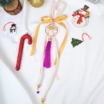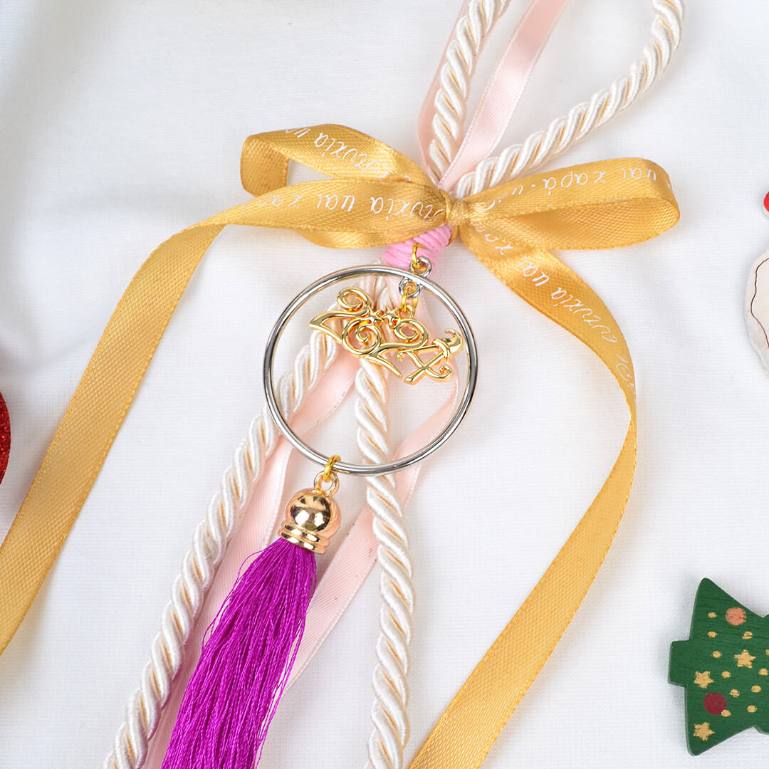 Χειροποίητο κρεμαστό γούρι 2024 φτιαγμένο με μπεζ σατέν κορδόνι, μώβ φουντίτσα και πέταλο.