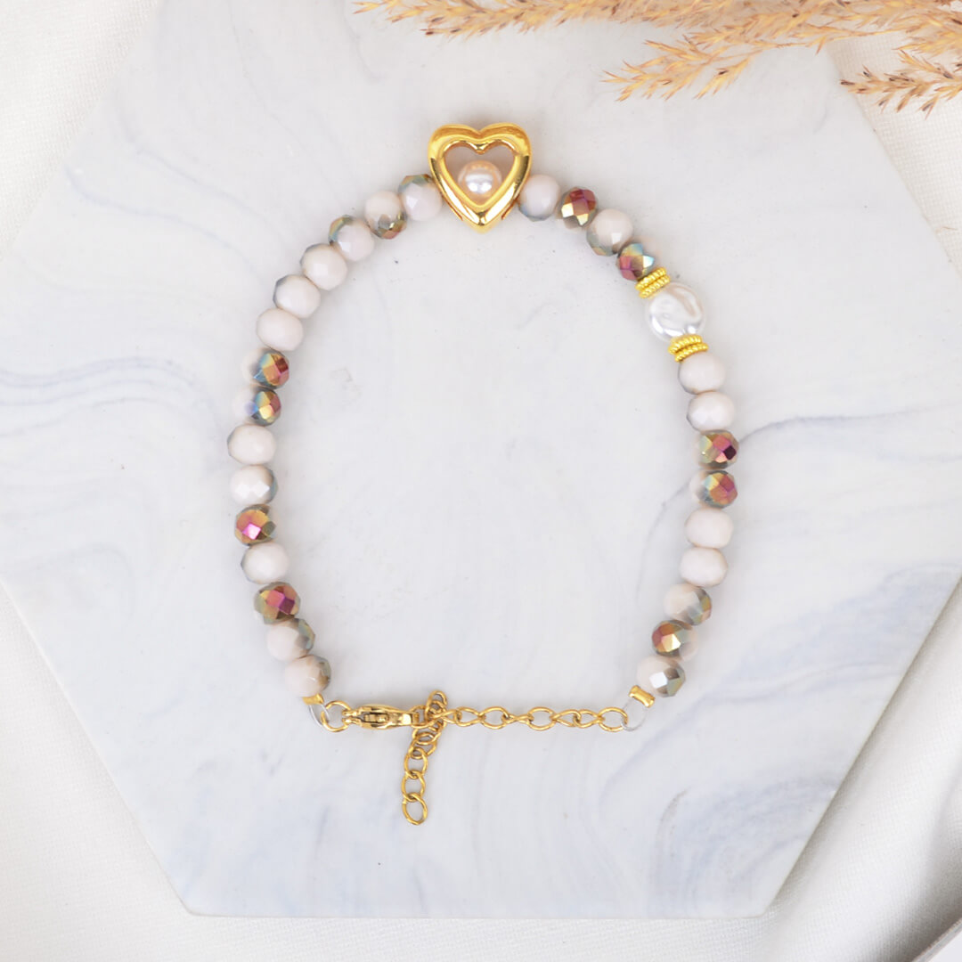 Χειροποίητο βραχιόλι με κρύσταλλα και στοιχείο καρδούλα. Το μήκος του είναι 17-23 εκατοστά.  Συνδύασε το με τα υπόλοιπα της συλλογής για μοναδικές εμφανίσεις. Σε περίπτωση που επιθυμείτε διαφορετικό μήκος μπορείτε να το αναγράψετε στις παρατηρήσεις.