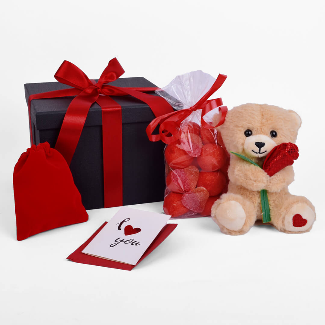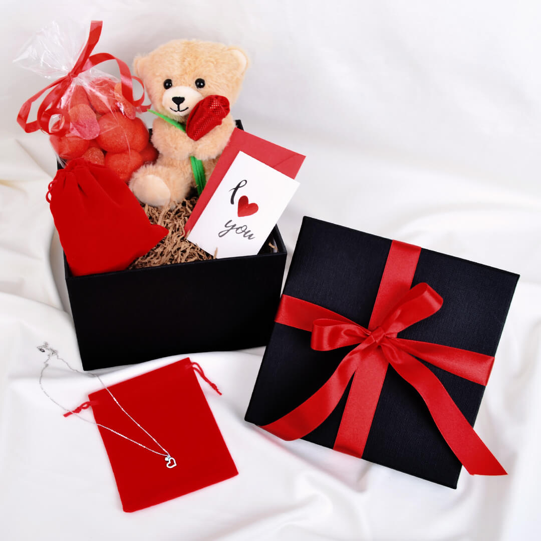 Μέσα σε ένα υπέροχο μαύρο κουτί πολυτελείας θα βρείτε ένα ασημί κολιέ με ζιρκόν καρδούλα μέσα σε κατακόκκινο βελούδινο πουγκάκι, ένα λούτρινο αρκουδάκι με τριαντάφυλλο, σακουλάκι με κόκκινα γλυκά marshmallows ζαχαρωτά και ρομαντική κάρτα ευχών με το φακελάκι της. Το κουτί αποστέλλεται με κατακόκκινη σατέν κορδέλα και εξωτερική προστατευτική συσκευασία. Το κολιέ είναι από ανοξείδωτο ατσάλι στα 40cm (+5 προέκταση).