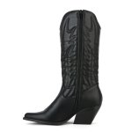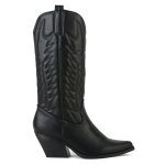 Μαύρη γυναικεία cowboy μπότα με τακούνι. Το υλικό της είναι ματ τεχνόδερμα πλήρως αδιάβροχο. Η φόρμα της είναι κανονική οπότε επιλέγουμε κανονικά το νούμερο μας. Το ύψος του τακουνιού είναι στους 8 πόντους με φιάπα μπροστά 1 πόντου.