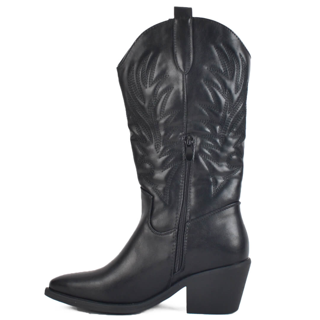 Μαύρη γυναικεία cowboy μπότα με τακούνι. Το υλικό της είναι ματ τεχνόδερμα πλήρως αδιάβροχο. Η φόρμα της είναι κανονική οπότε επιλέγουμε κανονικά το νούμερο μας. Το ύψος του τακουνιού είναι στους 6 πόντους. Η σόλα τους είναι από θερμολάστιχο, με αποτέλεσμα να είναι πολύ ελαφριά και με μαλακό πάτημα. Ιδανική επιλογή για όλη την ημέρα.