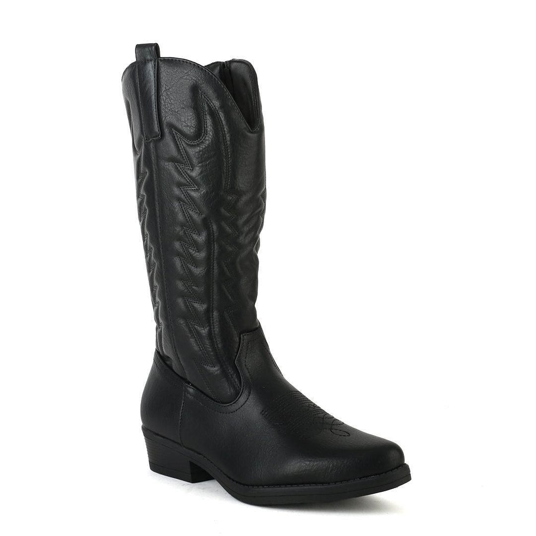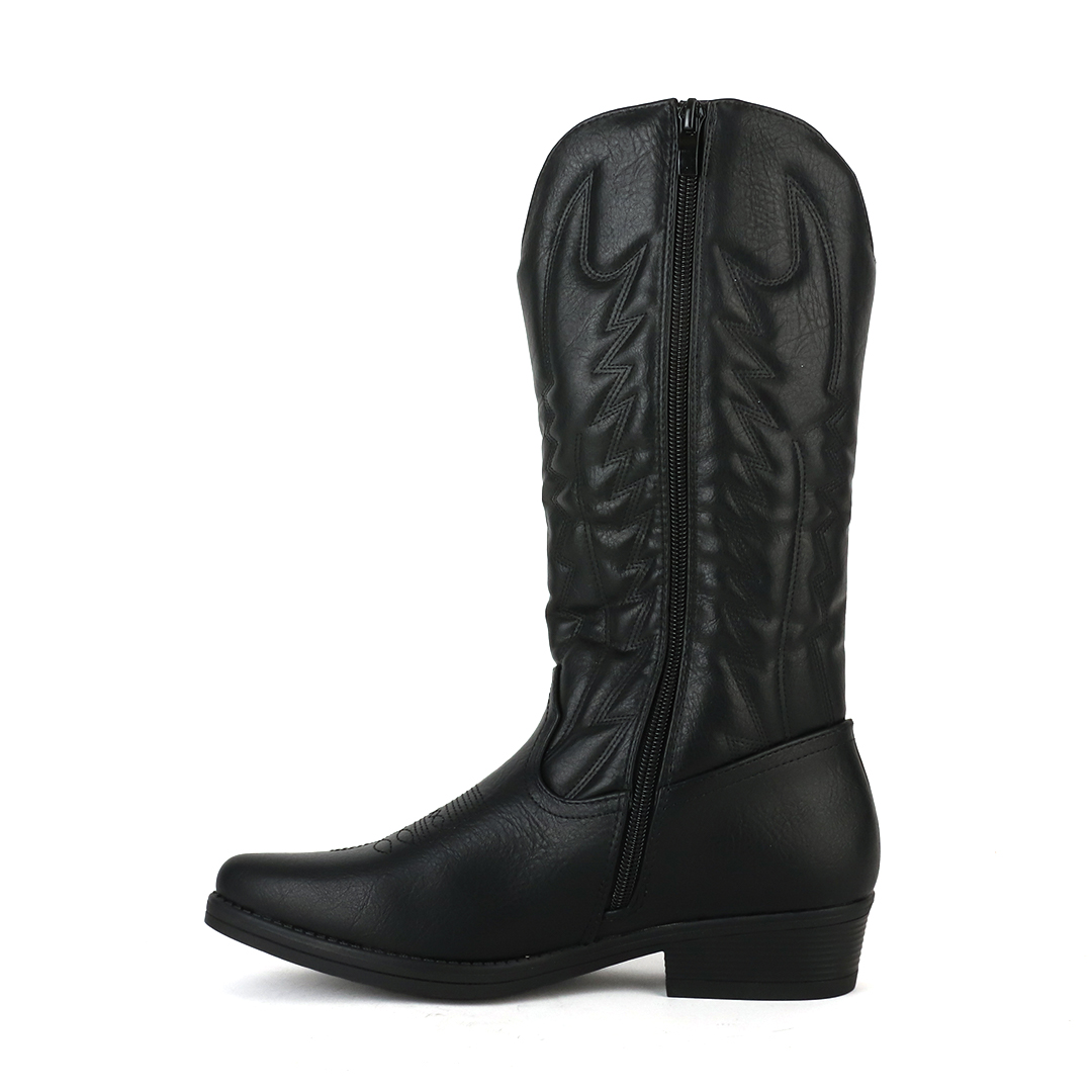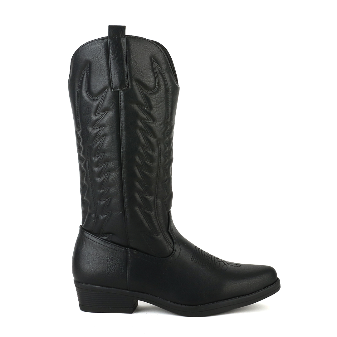Μαύρη γυναικεία flat cowboy μπότα . Το υλικό της είναι ματ τεχνόδερμα πλήρως αδιάβροχο. Η φόρμα της είναι κανονική οπότε επιλέγουμε κανονικά το νούμερο μας. Ιδανική για όλη την ημέρα.