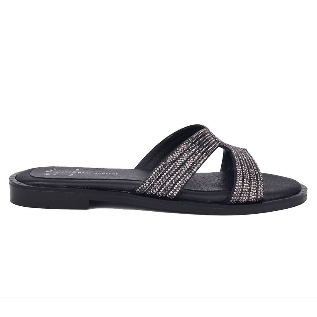 Flat γυναικεία παντόφλα με στρας, κατασκευής εργοστασίου μας.  Η φόρμα τους είναι κανονική προς άνετη οπότε επιλέγουμε το νούμερό μας. Η σόλα τους είναι από θερμολάστιχο με αποτέλεσμα να είναι πολύ ελαφριά και άνετη στο περπάτημα. Ο πάτος τους είναι ενισχυμένος για ακόμα πιο μαλακό πάτημα.