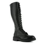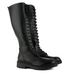 Μαύρη ψηλή μπότα με λειτουργικά κορδόνια και εσωτερικό φερμουάρ για πανεύκολη χρήση, κατασκευής εργοστασίου μας. Το υλικό της είναι ματ τεχνόδερμα πλήρως αδιάβροχο. Η φόρμα της είναι κανονική οπότε επιλέγουμε κανονικά το νούμερο μας. Το ύψος της στην γάμπα είναι στους 32 πόντους. Η σόλα της είναι από θερμολάστιχο, στους 3 πόντους, με αποτέλεσμα να είναι πολύ ελαφριά και άνετη στο περπάτημα.