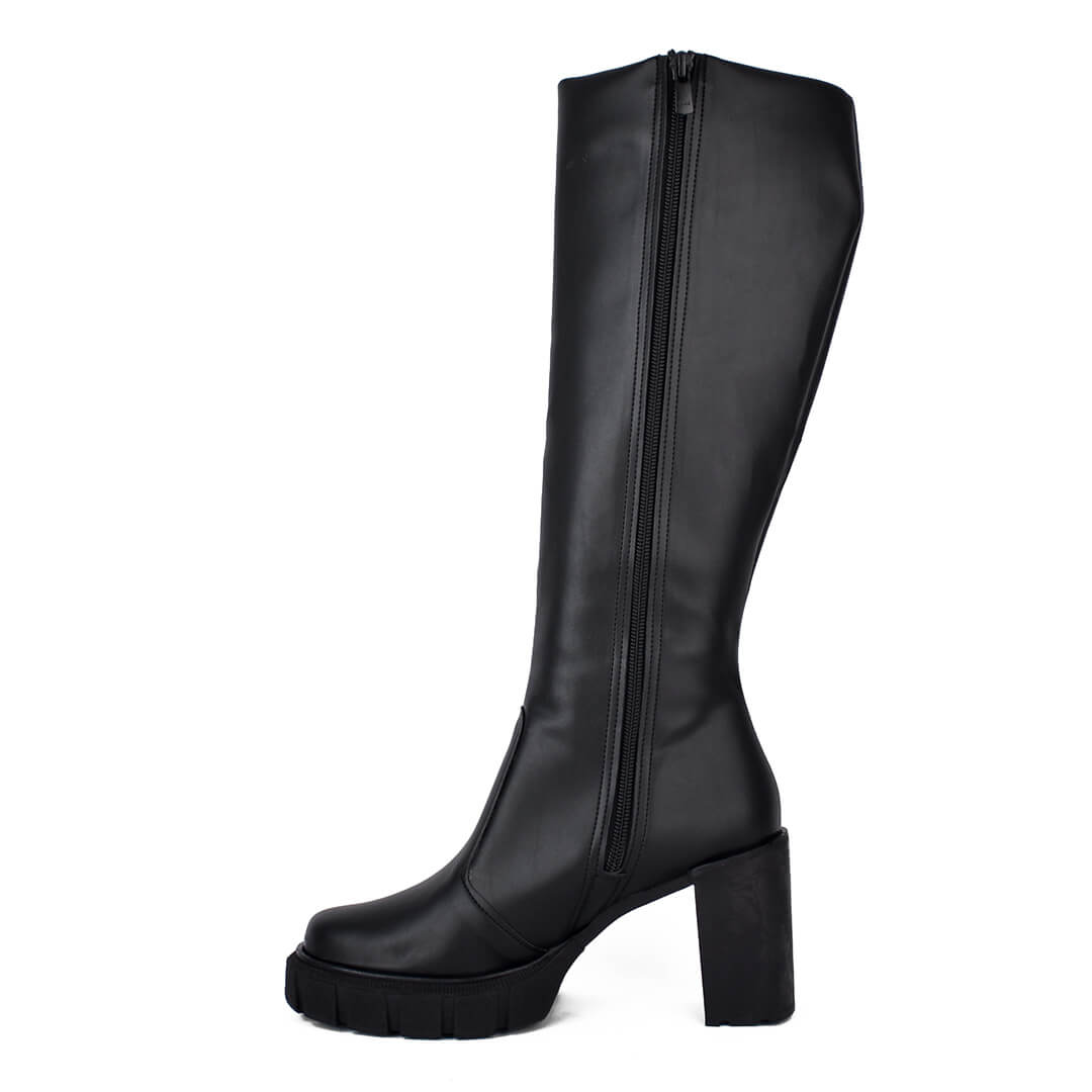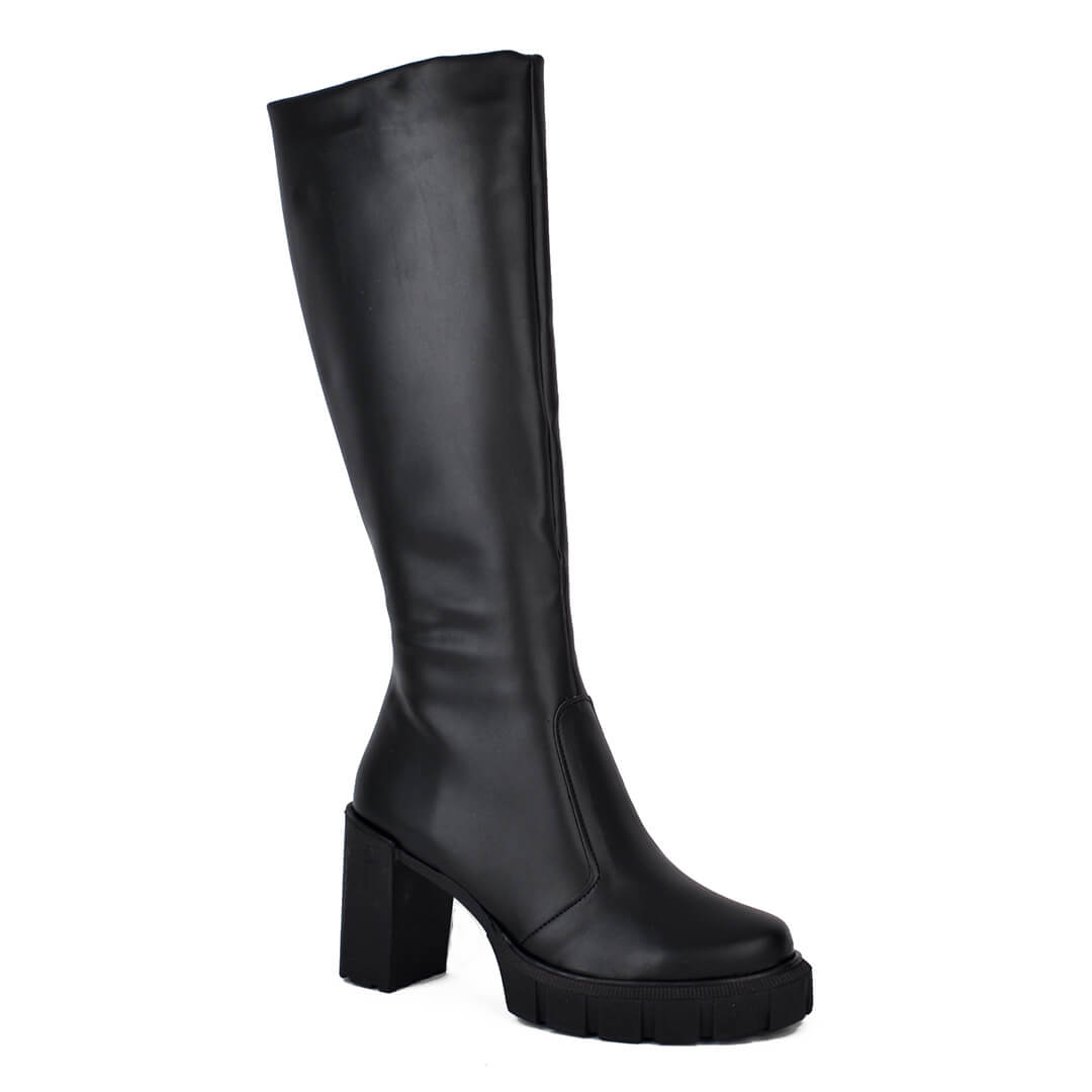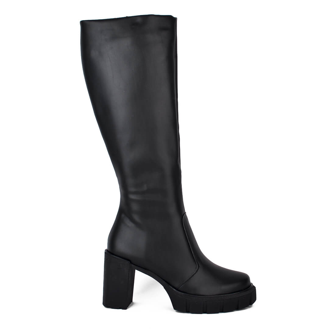 Μαύρη γυναικεία μπότα με τακούνι, κατασκευής εργοστασίου μας, σε ματ τεχνόδερμα. Διαθέτει λειτουργικό φερμουάρ στην εσωτερική πλευρά για πανεύκολη χρήση.  Η φόρμα τους είναι κανονική οπότε επιλέγουμε κανονικά το νούμερο μας. Το ύψος του τακουνιού είναι στους 8 πόντους με φιάπα μπροστά 2 πόντων. Το ύψος του παπουτσιού στην γάμπα μας είναι 38 εκατοστά.