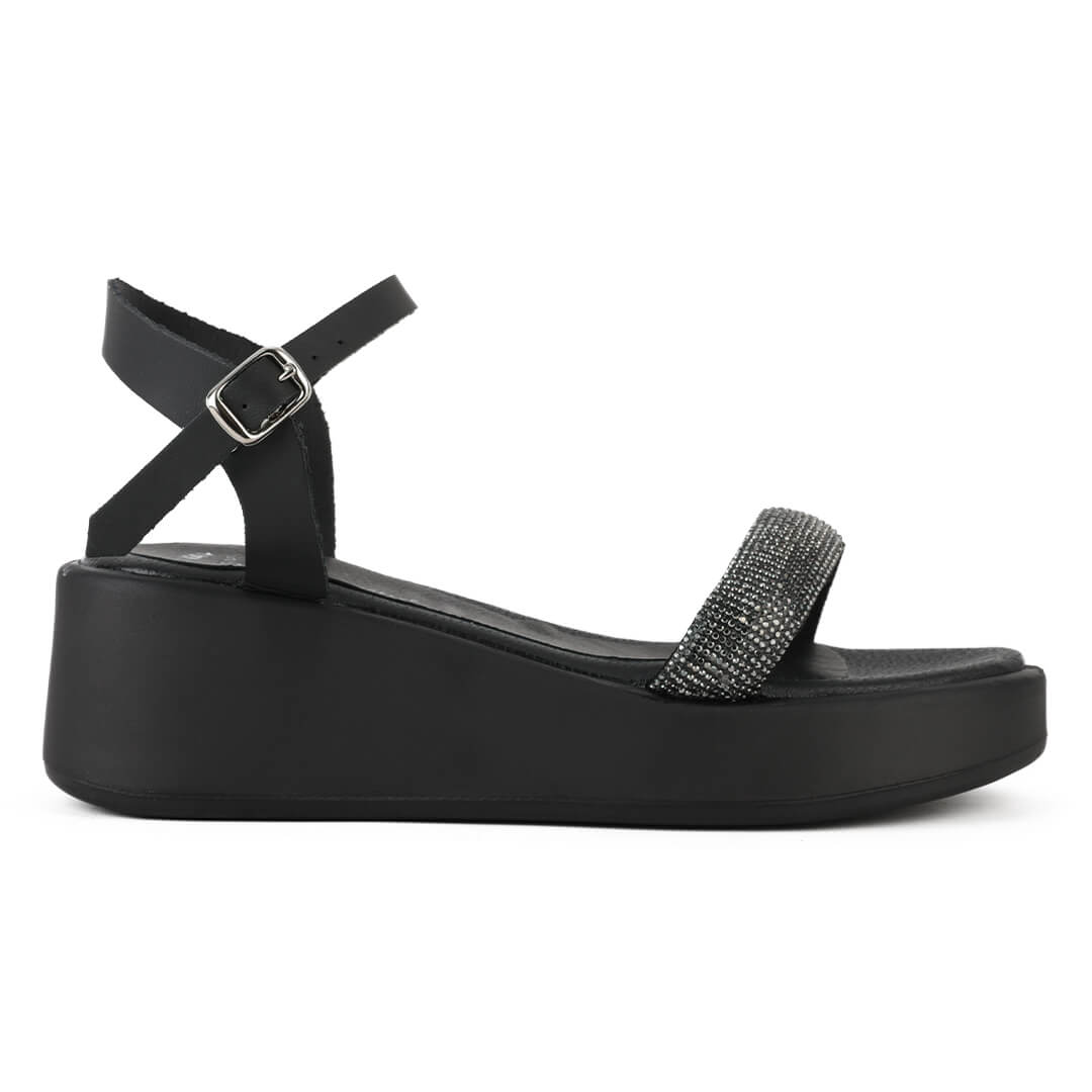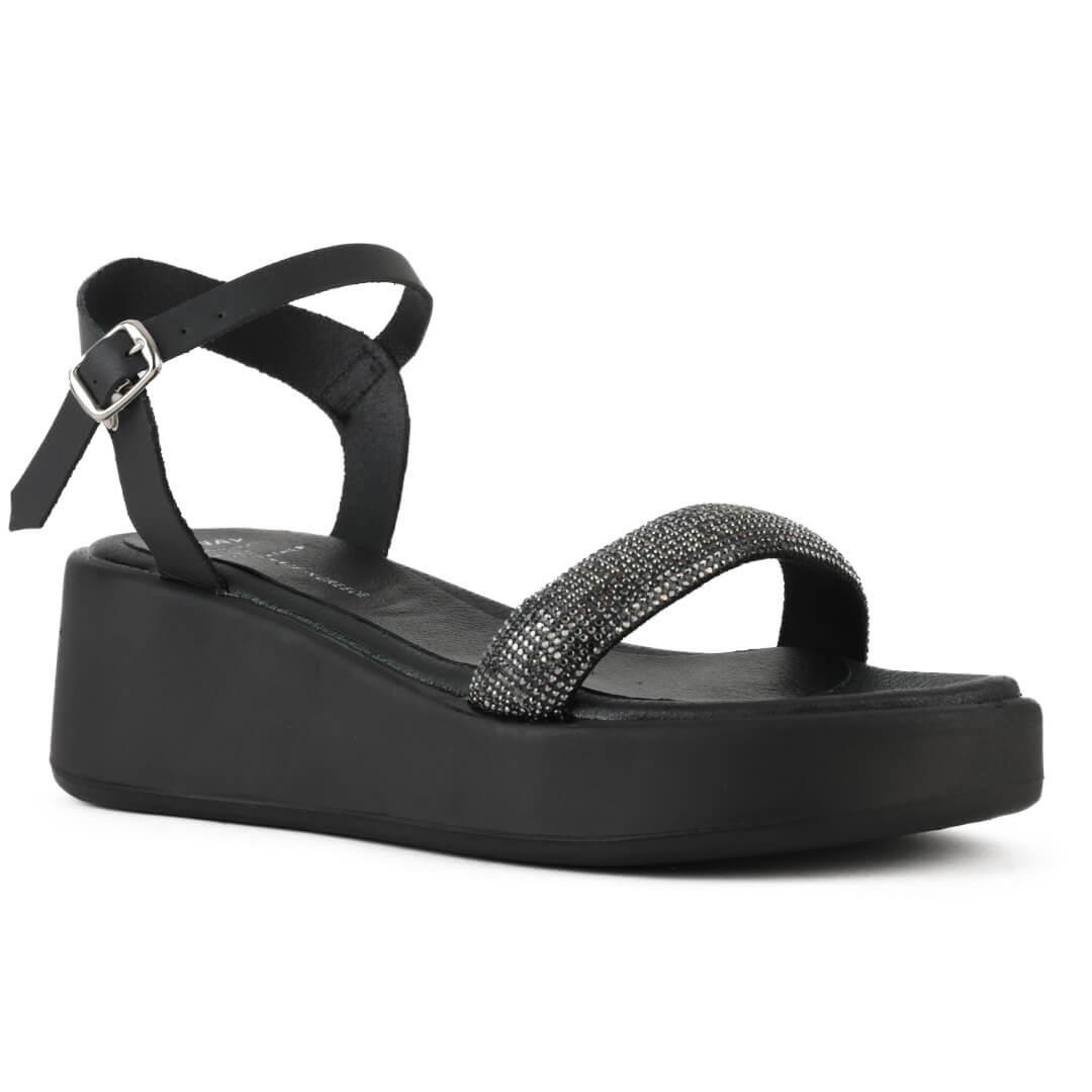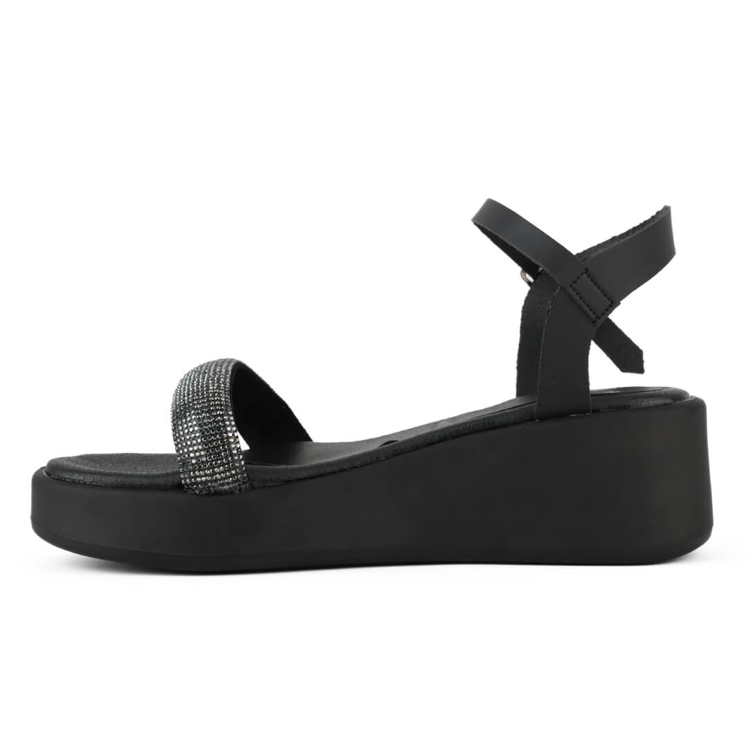Μαύρο ανατομικό δερμάτινο πέδιλο με strass