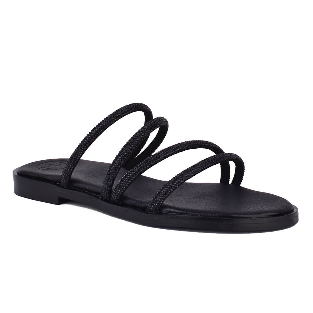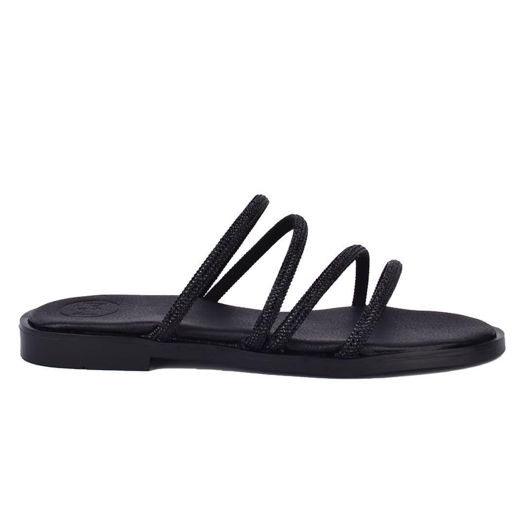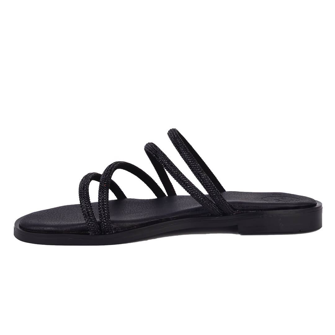 Flat γυναικεία παντόφλα με στρας, κατασκευής εργοστασίου μας.  Η φόρμα τους είναι κανονική προς άνετη οπότε επιλέγουμε το νούμερό μας. Η σόλα τους είναι από θερμολάστιχο με αποτέλεσμα να είναι πολύ ελαφριά και άνετη στο περπάτημα. Ο πάτος τους είναι ενισχυμένος για ακόμα πιο μαλακό πάτημα.
