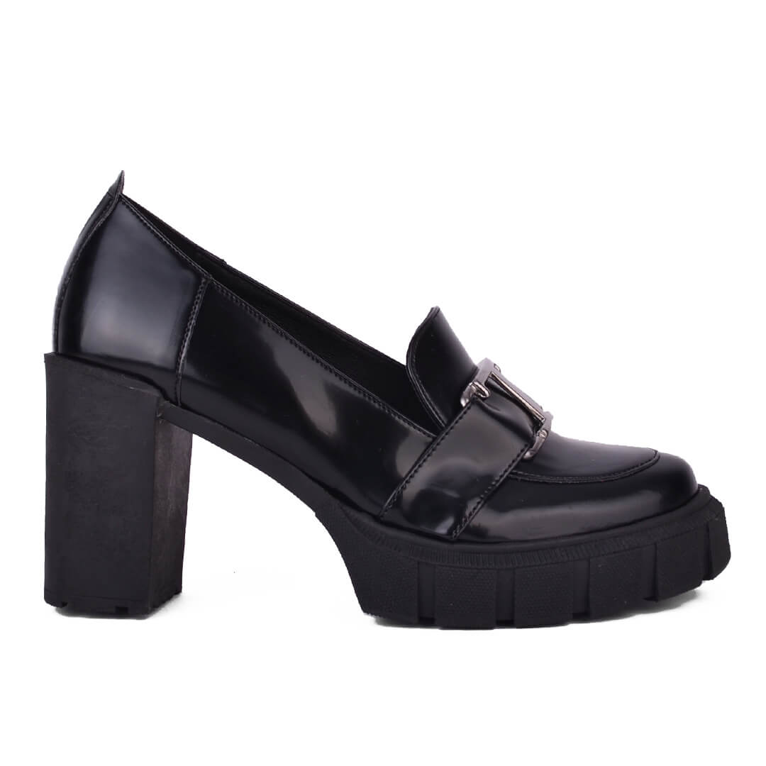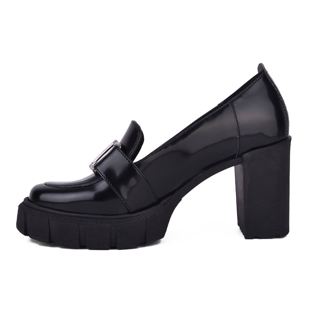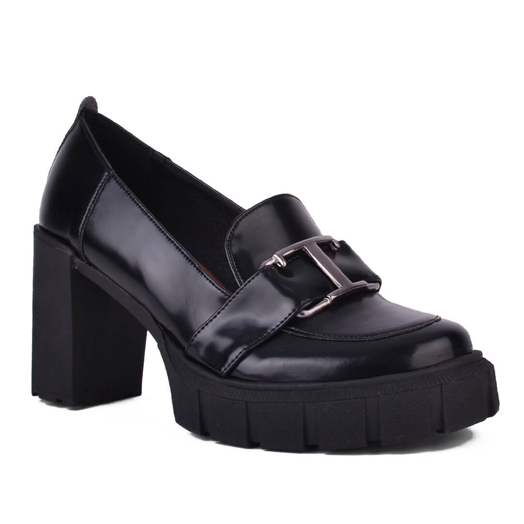 Μαύρο γυναικείο loafer με τακούνι, κατασκευής εργοστασίου μας. Το υλικό του είναι πλήρως αδιάβροχο ελαστικό τεχνόδερμα. Το ύψος του είναι στους 8 πόντους πίσω και 2 πόντους μπροστά. Η σόλα τους είναι από θερμολάστιχο με αποτέλεσμα να είναι πολύ άνετη και ελαφριά.  Η φόρμα τους είναι κανονική οπότε επιλέγουμε κανονικά το νούμερο μας. Το εσωτερικό τους είναι δερμάτινο. Ιδανική επιλογή από το πρωί μέχρι το βράδυ.