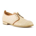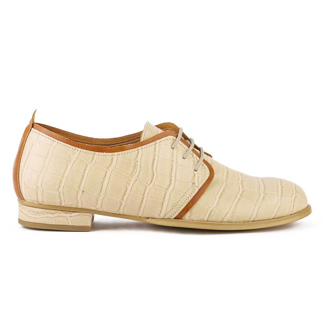 Μπεζ δετό κατασκευής εργοστασίου μας με σχέδιο κροκό. Η φόρμα του είναι κανονική, οπότε επιλέγουμε κανονικά το νούμερό μας.