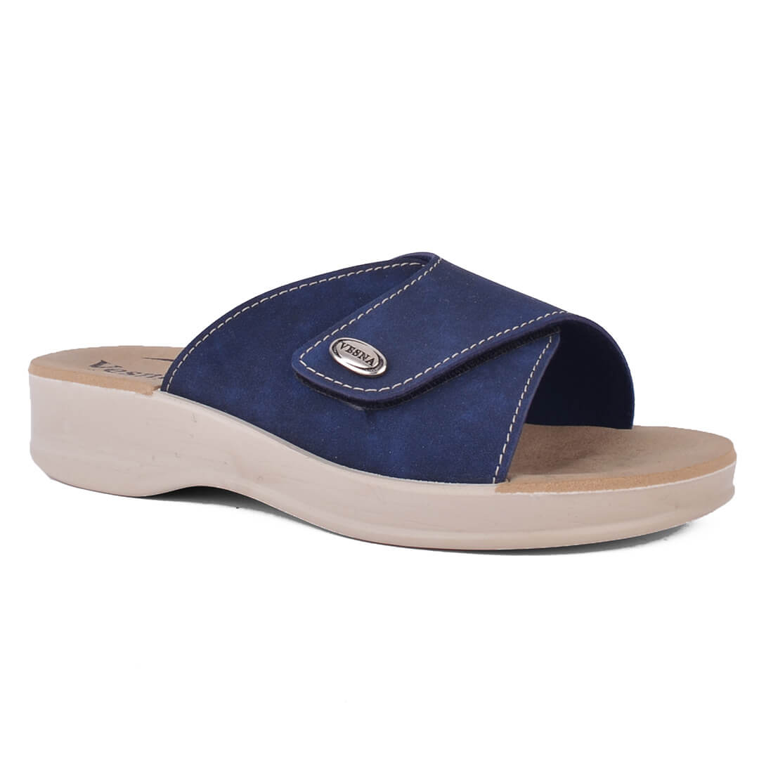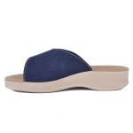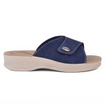 Μπλε γυναικεία ανατομική παντόφλα με χιαστί χράτς. Ο πάτος τους είναι δερμάτινος και διαθέτει ειδικό gel ενίσχυσης για πολύ μαλακό και άνετο πάτημα. Η ειδικά σχεδιασμένη ανατομική σόλα τους είναι στους 3,5 πόντους πίσω με 1,5 πόντο μπροστά, προσφέρει έτσι την κατάλληλη κλίση και ταυτόχρονα απορροφά όλους τους κραδασμούς. Ιδανική επιλογή για όλη την ημέρα και για πολύωρη ορθοστασία.