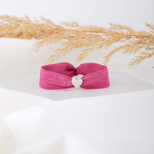 Χειροποίητο βραχιόλι με ροζ σατεν ελαστική κορδέλα και καρδιά σε ασημί χρώμα. Το δέσιμο της κορδέλας γίνεται συνήθως στα 17 εκατοστά και επειδή είναι ελαστική προσαρμόζεται πάνω σε όλους τους καρπούς. Σε περίπτωση που επιθυμείτε διαφορετική διάσταση, μπορείτε να το σημειώσετε στις παρατηρήσεις.