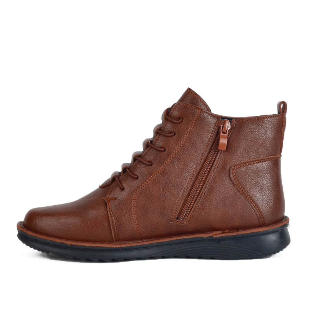 Γυναικείο ραφτό μποτάκι με κορδόνι λάστιχο. Το υλικό του είναι πλήρως αδιάβροχο ελαστικό τεχνόδερμα. Το ύψος του είναι στους 2,5 πόντους με 1,5 πόντο φιάπα, προσφέροντας την κατάλληλη κλίση για την μέση. Η σόλα τους είναι από θερμολάστιχο με αποτέλεσμα να είναι πολύ άνετη και πλήρως αντικραδασμική. Κατασκευασμένο με extra soft τεχνολογία προσφέρει πολύ μαλακό και ελαφρύ πάτημα. Η φόρμα τους είναι κανονική οπότε επιλέγουμε κανονικά το νούμερο μας. Διαθέτει εσωτερικό λειτουργικό φερμουάρ για πολύ εύκολη χρήση. Ιδανική επιλογή από το πρωί μέχρι το βράδυ.