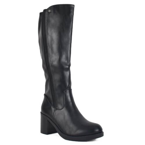 Μαύρη γυναικεία μπότα με τακούνι. Το υλικό της είναι ματ τεχνόδερμα πλήρως αδιάβροχο. Η φόρμα της είναι κανονική οπότε επιλέγουμε