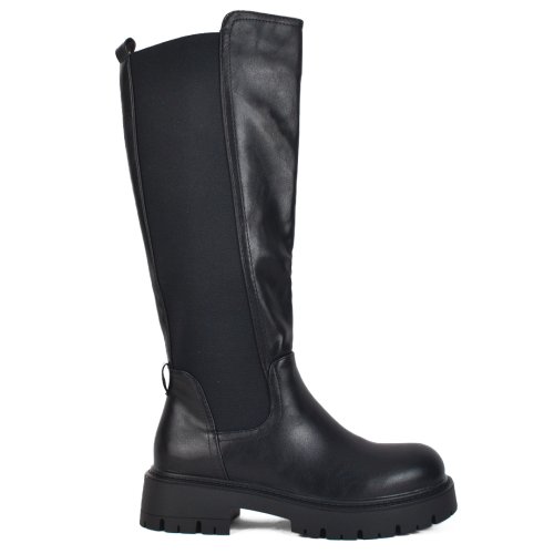 Μαύρη μπότα με λάστιχο στην γάμπα. Το υλικό της είναι ματ τεχνόδερμα πλήρως αδιάβροχο. Η φόρμα της είναι κανονική οπότε